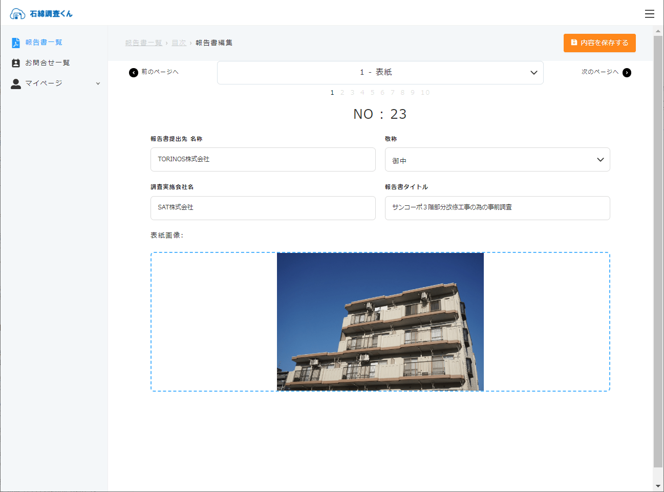 報告書の作成がこれひとつでできるというのが楽でした。WordとかExcelとかあれこれいろいろなツールを使って作った一枚一枚の報告書を自分でまとめる、といった作業の必要なし。写真を一括アップロードして種類ごとに整理・保管ができるのも嬉しいです。