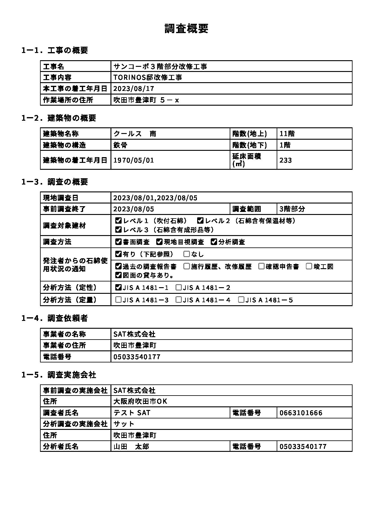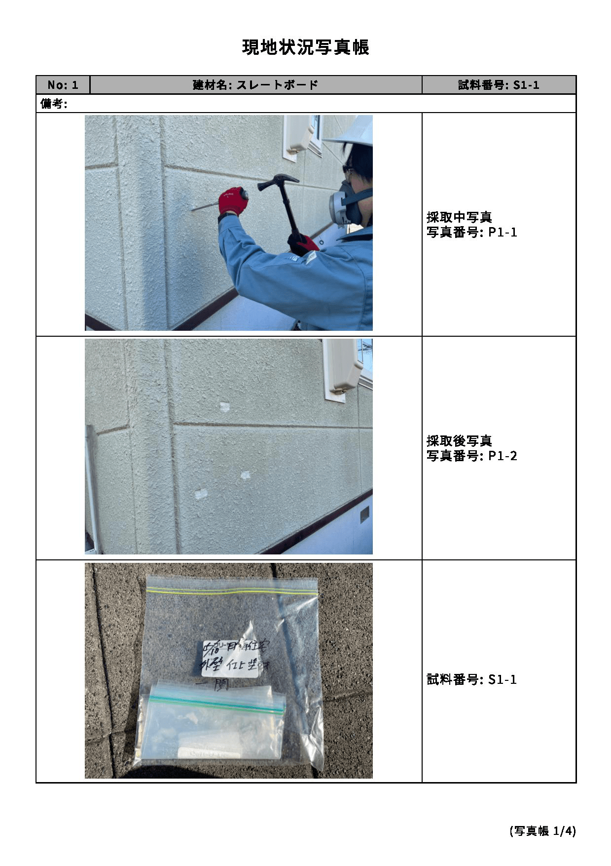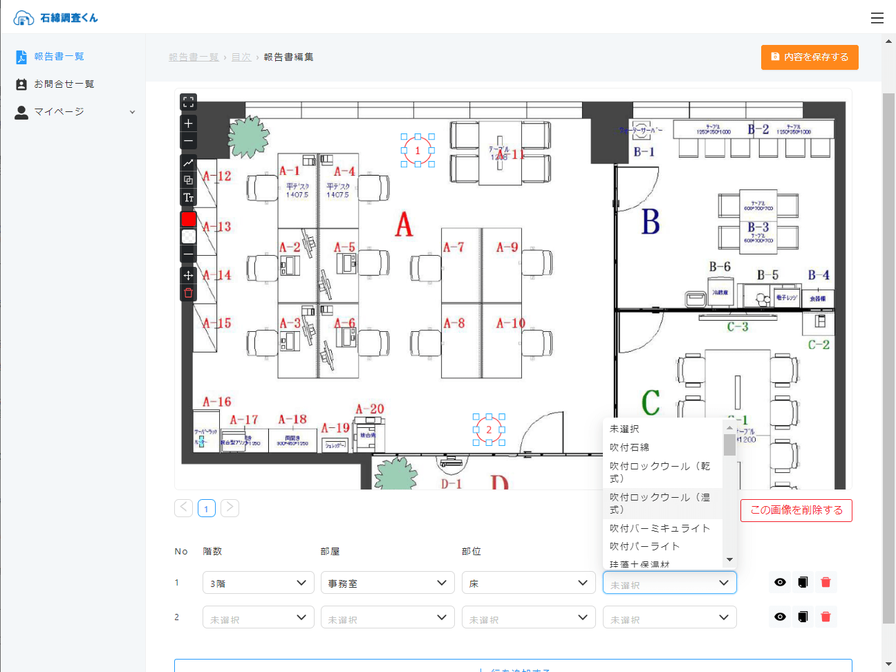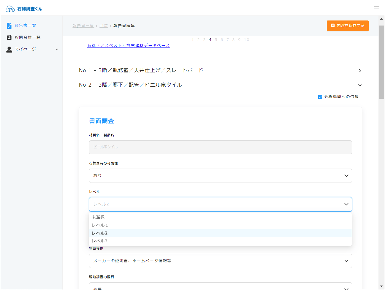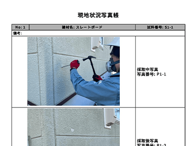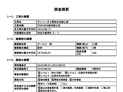 「石綿調査くん」では、用意されたフォーマットに必要な項目を入力するだけで簡単にキレイで正確な報告書ができあがります。
